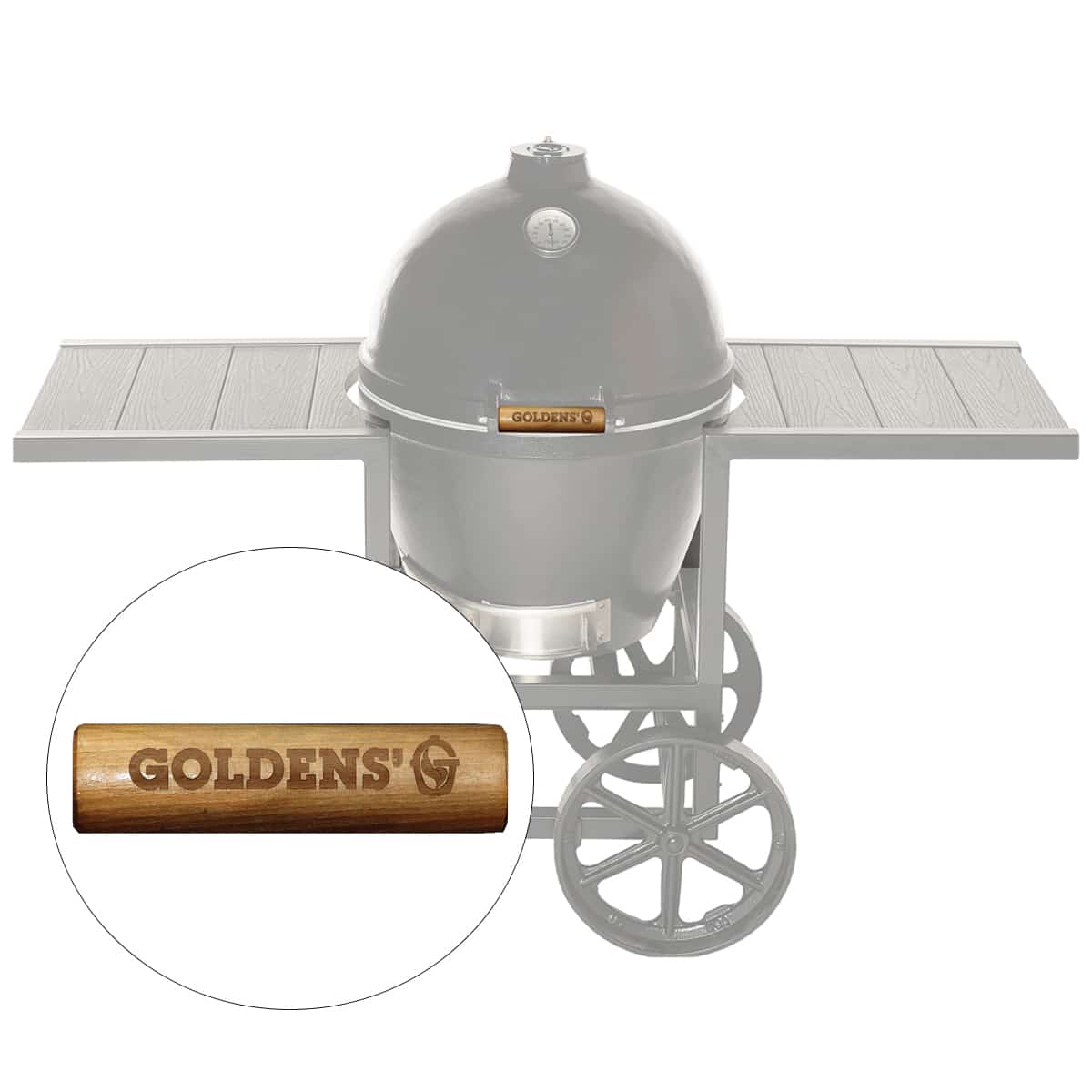 Yes! Goldens’ Cast Iron offers a beautiful American-made wooden handle with parallel grains that offer strength and durability. The handle has a custom branded logo and is protected with a clear polyurethane finish. The handle is attached to the lid or top section of our 20.5″ Kamado Cooker.