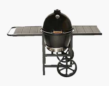 It’s definitely heavier and more durable than ceramic kamados. Our Stand Alone cooker weighs 334 pounds. The 20.5″ Cooker with Trex® Table Cart weighs 460 pounds, or roughly the size of two grown men standing next to each other on your outdoor deck. By comparison, a “large” ceramic kamado is feather weight at roughly 160 pounds, but made of lighter, more fragile foreign made ceramic. So if it tips over, it’s destroyed. If our Goldens’ gets knocked over, which would take a lot of force, you just pick it up and keep cooking. Just knock the dirt and ash off the meat unless you’re a beast!